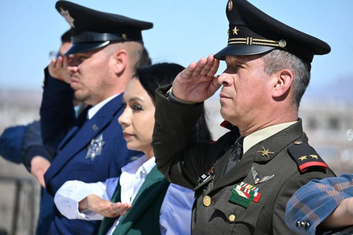 Ascensión.- En el marco de la conmemoración del Día de la Bandera, la presidenta municipal, Lic. Ivonne De La Hoya Venzor, asistió a la Guarnición Militar de Puerto Palomas de Villa para presenciar el izamiento de la macro Bandera Nacional Mexicana, reconocida oficialmente como la más bonita del mundo.