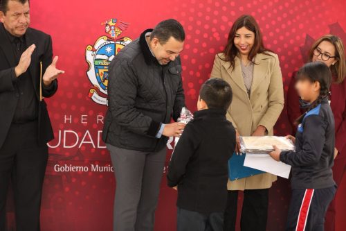En la entrega también estuvieron la alumna Yareli Espino, Rosario Minerva González, directora del plantel en el turno vespertino; Sandra Elena Morales, supervisora Escolar Zona 68; Armando Díaz, supervisor de Educación Física; Ismael Rueda, coordinador de Infraestructura Educativa del Municipio; Daniel González García, director general de Obras Públicas; Guillermo Alvídrez, director de Educación, así como los regidores Jorge Marcial Bueno y Mauricio Padilla.