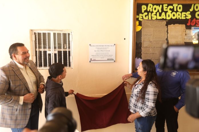 Ciudad Juárez.- Como parte de los trabajos de rehabilitación de planteles educativos de la ciudad, el Presidente Municipal, Cruz Pérez Cuéllar, entregó a los alumnos y docentes de la Escuela Secundaria Técnica 41 la restauración de pintura en el plantel y un domo que los cubrirá de las inclemencias del clima.