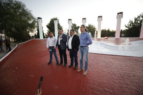Ciudad Juárez.- Con el objetivo de mejorar los espacios públicos de la ciudad y la comunidad los aproveche, el Presidente Municipal, Cruz Pérez Cuéllar, llevó a cabo la entrega de los trabajos de rehabilitación de la Fuente-Monumento Triunfo de la Republica.