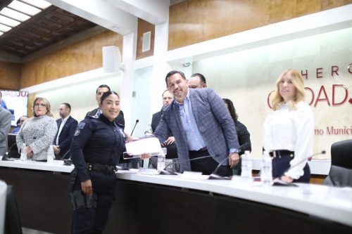 Los regidores reconocieron también a Teresa Paloma Domínguez Santoyo, elemento de la Coordinación General de Seguridad Vial, quien la noche del 12 de noviembre 2024, mientras patrullaba notó la presencia de una chica de 18 años de edad que se encontraba al borde del puente de la avenida Sanders, con la intención de quitarse la vida.