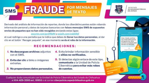 Noticias de Chihuahua.- La Secretaría de Seguridad Pública del Estado (SSPE) a través de su Unidad de Policía Cibernética, lanzó una alerta a la población por robo de información personal a través de un mensaje para recoger un paquete.