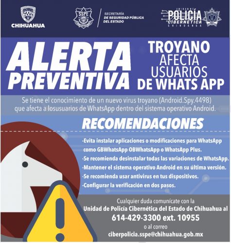 Noticias de Chihuahua.- Derivado de los análisis de la Dirección de Policía Cibernética de la Secretaría de Seguridad Pública del Estado (SSPE), se detectó un virus troyano que afecta el programa de mensajería WhatsApp.