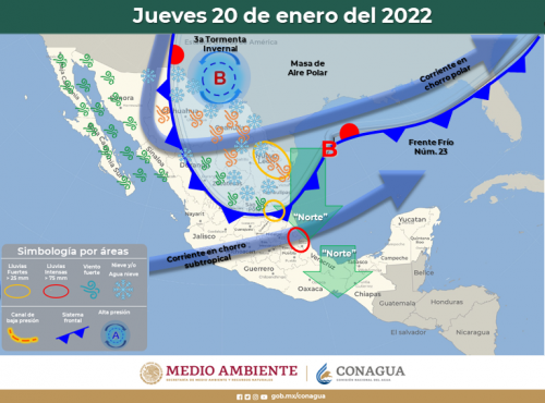 De acuerdo con el pronóstico del Servicio Meteorológico Nacional, el fenómeno será ocasionado por una vaguada polar y la fuerte entrada de humedad generada por la corriente en chorro, en interacción con el nuevo frente frío 23 y su masa de aire polar.