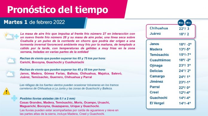 Para mañana martes primero de febrero, las temperaturas en °C máx./min oscilarán entre los: Chihuahua 22/3, Juárez 18/2, Janos 18/-2, Madera 13/-5, Temósachic 15/-7, Cuauhtémoc 18/-2, Ojinaga 23/3, Delicias 24/2, Camargo 24/1, Jiménez 23/-1, Parral 22/0, Creel 12/-4, Guachochi 14/-4 y El Vergel 14/-4.