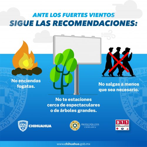 Noticias de Chihuahua.- La Coordinación Estatal de Protección Civil (CEPC) informó que continúa en alerta todo el estado, debido a la presencia de fuertes vientos, por lo que exhorta a la población a continuar con las medidas de prevención recomendadas por la dependencia estatal, ante el riego de accidentes ocasionados por las fuertes rachas.