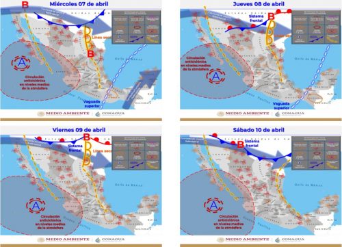 Indicó que las temperaturas esperadas para el miércoles 7 de abril son (máx/mín°C): Chihuahua 29/16, Juárez 28/12, Janos 28/10, Madera 22/7, Temósachic 23/6, Cuauhtémoc 26/12, Ojinaga 32/20, Delicias 31/17, Camargo 31/16, Jiménez 30/15, Parral 29/17, y El Vergel 23/4.