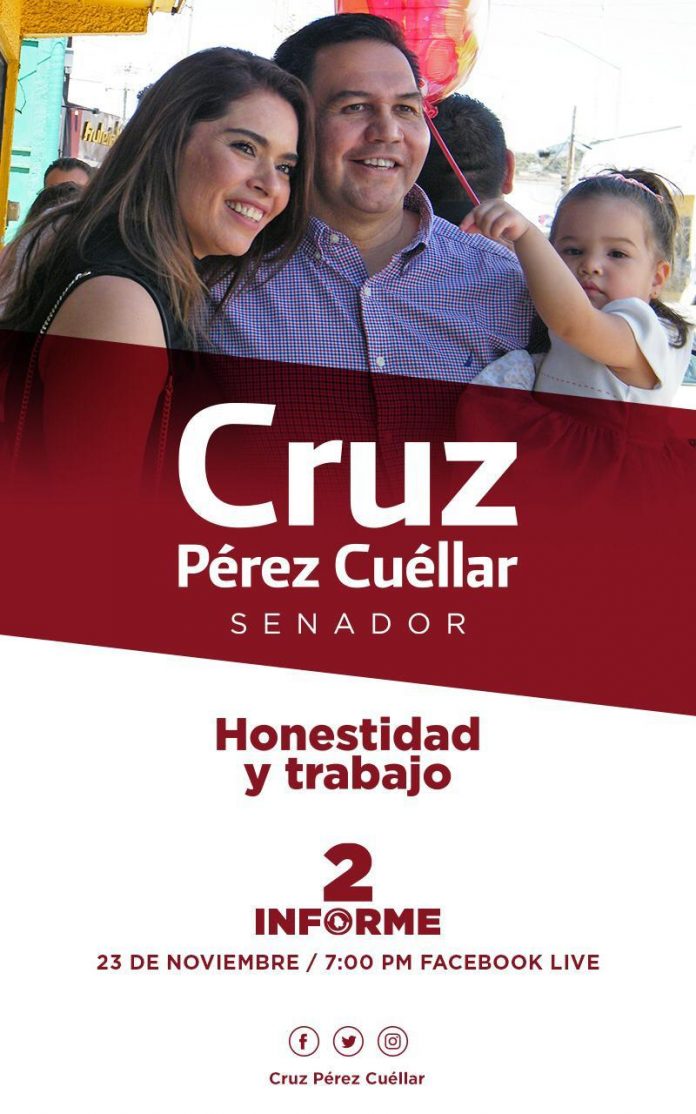 El informe del senador Cruz Pérez Cuéllar se presentará este lunes, por esta ocasión, a través de la plataforma digital de Facebook Live, a partir de las 7:00 de la tarde, atendiendo las restricciones por la pandemia del SARS-CoV-2 (COVID-19).