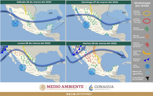 Mientras para el lunes 28 para el frente frío (posible número 39) se situará sobre el noroeste de México con rachas que pueden superar los 65 y 75 km/h en Janos, Casas Grandes y Majalca Janos, Madera, Ignacio Zaragoza, Gómez Farias, Sueco y Sacramento; asimismo podrán alcanzar hasta 55 km/h en Ahumada, Palomas, Buenaventura, Namiquipa, Cuauhtémoc, Riva Palacio, Chihuahua, San Francisco de Borja, Satevó, Parral, Guadalupe, Nuevo Casas Grandes, Bocoyna, Balleza y Jiménez;