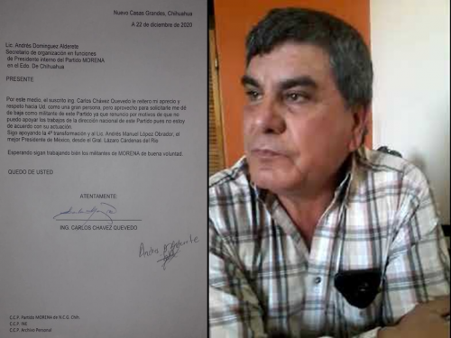 Nuevo Casas Grandes. – El día de hoy el Ing. Carlos Chávez Quevedo, militante de MORENA desde el inicio del movimiento y reconocido seguidor de Andrés Manuel López Obrador en el Estado de Chihuahua, presentó su renuncia como miembro de dicho partido a través de un escrito dirigido al Lic. Andrés Domínguez Alderete, Secretario de Organización en funciones de Presidente Interino del partido MORENA, el cual detalla lo siguiente: