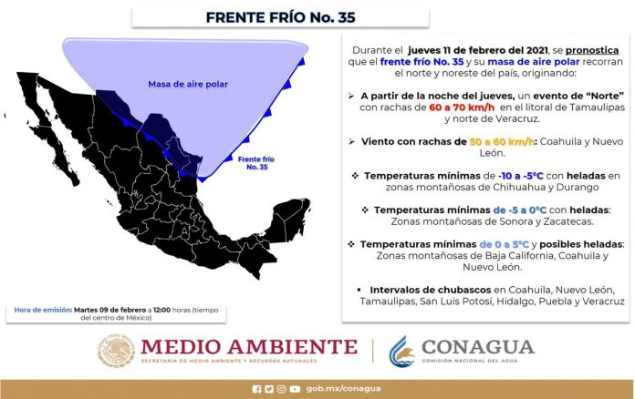 De acuerdo al Sistema Meteorológico Nacional, este jueves 11 ingresará el frente frío número 35 por el noroeste de la entidad, y en interacción con la corriente en chorro y una vaguada superior, ocasionará el desplome de las temperaturas a partir del sábado 13.