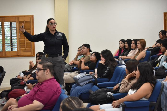 Noticias de Chihuahua.- Este lunes, la Fiscalía de Distrito Zona Norte, a través del Grupo de Orientación Escolar Chihuahuense (GOECHI), de la Agencia Estatal de Investigación (AEI), inauguró su participación en la “Semana de la Licenciatura de Seguridad y Políticas Públicas”, de la Universidad Autónoma de Ciudad Juárez.