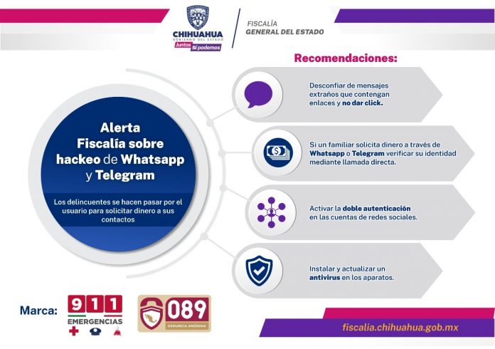 Noticias de Chihuahua.- La Fiscalía General del Estado (FGE) emitió una alerta a la ciudadanía, sobre el hackeo de cuentas de aplicaciones digitales como Whatsapp y Telegram, que realizan delincuentes para obtener información de los contactos y solicitarles dinero.
