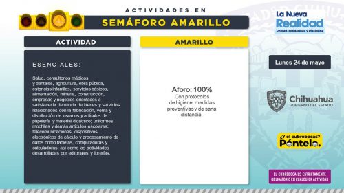 Noticias de Chihuahua.- A partir de este lunes 24 de mayo y durante los siguientes 15 días, todo el estado de Chihuahua permanecerá en semáforo amarillo, toda vez que el nivel de contagios y hospitalizados por COVID-19 disminuyó gracias a las medidas para la reducción de la movilidad en la entidad.