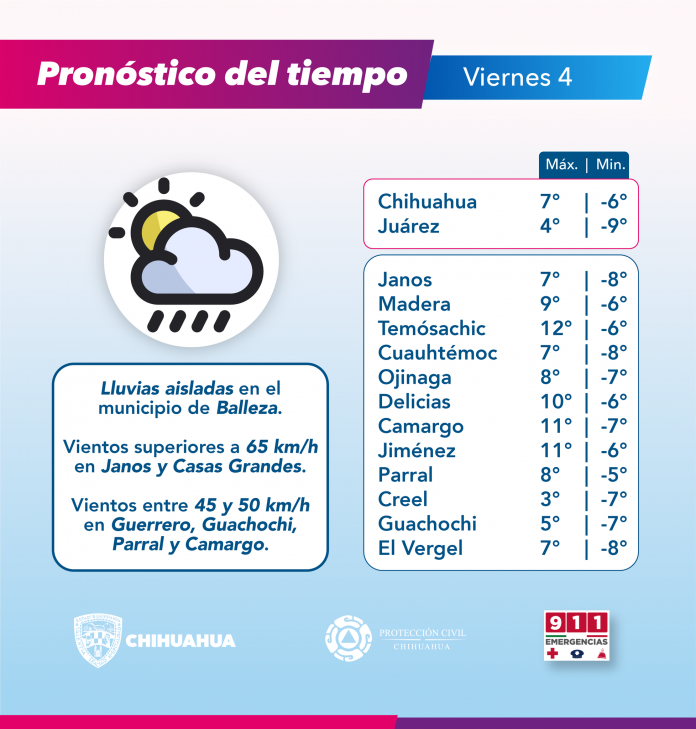 Mientras para este sábado 5, las temperaturas en Nuevo Casas Grandes (Máx. Mín.) 12° /C -3°C, Madera 8° C /-7° C, Creel con 8 ° C /-6 ° C, así mismo para la zona centro- sur las temperaturas oscilaran para Chihuahua 15°C/ 0° C, Delicias 15° C/-1°C, Camargo 15° C/0° C, H. del Parral 15° C/ -2° C , para la zona norte y este con temperaturas de 8° C/0° C en Cd. Juárez y de 13° C/-1° C en Ojinaga.