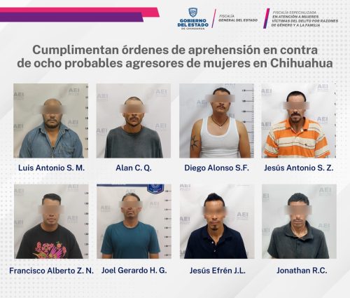 Noticias de Chihuahua.- En seguimiento a carpetas de investigación a cargo de la Fiscalía Especializada en Atención a Mujeres Víctimas del Delito por Razones de Género y a la Familia, elementos de la Agencia Estatal de Investigación detuvieron a ocho probables agresores en la ciudad de Chihuahua.