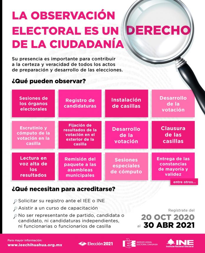 Noticias de Chihuahua.- El próximo 30 de abril es la fecha límite para acreditarse como observadora u observador electoral y así poder verificar de cerca las actividades del Proceso Electoral Local 2020-2021, desde la instalación de las casillas, hasta el cómputo de resultados electorales.