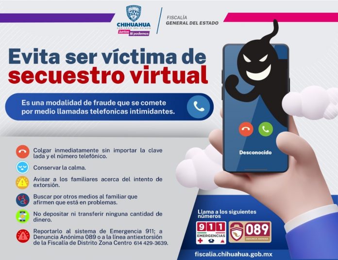 Noticias de Chihuahua.- El secuestro virtual es una modalidad de fraude que se comete por medio llamadas telefónicas intimidatorias de índole extorsiva, en la que el delincuente busca engañar a quienes las reciben, diciéndoles que tienen privado de su libertad a un ser querido, por el cual exigen el pago de un monto económico como pago de un rescate y dejarlo en libertad.