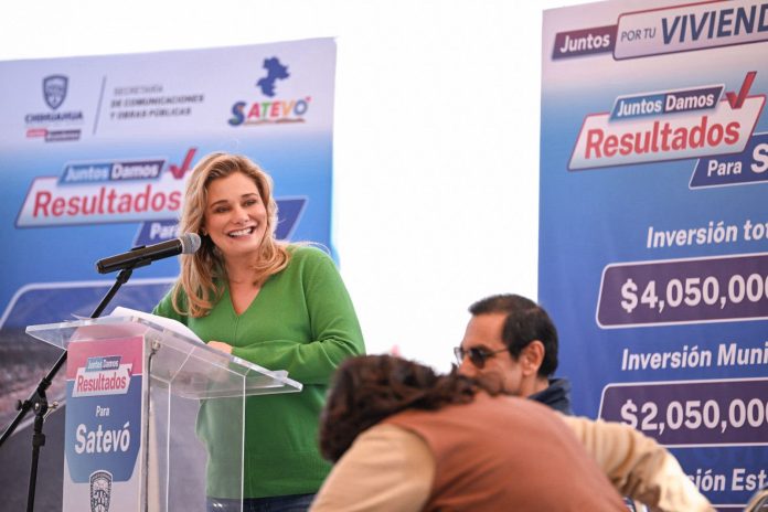 La alcaldesa de Satevó, Norma Muñoz, en su intervención agradeció los esfuerzos de la gobernadora Maru Campos, por transformar la calidad de vida de los habitantes del municipio.