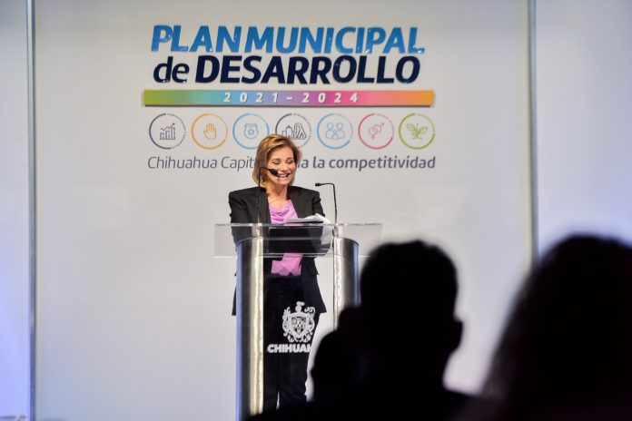 Ciudad de Chihuahua.- En el marco de la presentación del Plan Municipal de Desarrollo de la ciudad de Chihuahua, la Gobernadora del Estado, acompañó al Alcalde capitalino para refrendar su apoyo en las acciones futuras que se implementarán en la Ciudad de Chihuahua con este Plan Municipal, así como en las inversiones que se realizarán en conjunto en materia de agua potable y en la industria aeroportuaria.