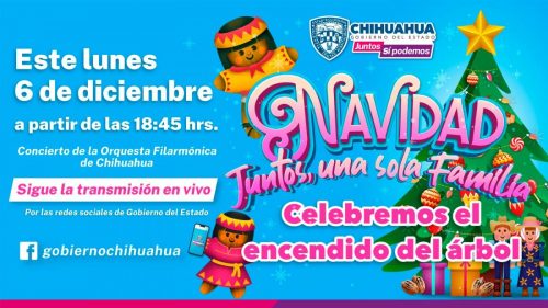 Noticias de Chihuahua.- El Gobierno del Estado invita este lunes 6 de diciembre a seguir el tradicional encendido del pino navideño a través de redes sociales, para que los chihuahuenses de todo el estado sean parte de esta celebración y disfrutar la Navidad juntos una sola familia.
