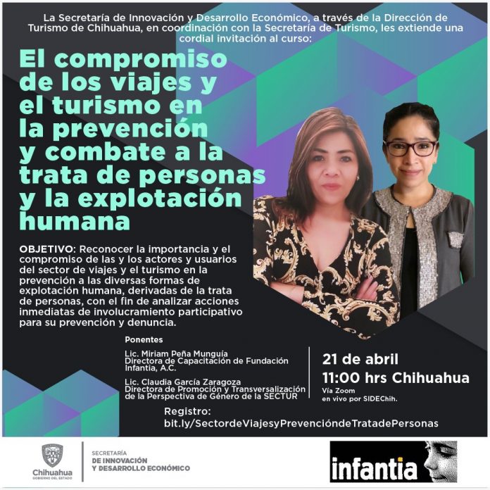 Noticias de Chihuahua.- La Secretaría de Innovación y Desarrollo Económico (SIDE) a través de la Dirección de Turismo, invitan al curso El compromiso de los viajes y el turismo en la prevención y combate a la trata de personas y la explotación humana.