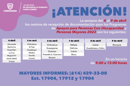 Noticias de Chihuahua.- El Gobierno del Estado, a través de la Secretaría de Desarrollo Humano y Bien Común del Gobierno del Estado, continuará esta semana con la recepción de papelería para los Programas de Apoyos para Personas Mayores y Personas con Discapacidad 2022, en 23 municipios para cubrir en su totalidad la entidad.