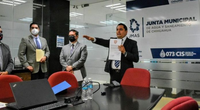 El acto protocolario estuvo a cargo del Director Ejecutivo de la Junta Central de Agua y Saneamiento (JCAS) Roberto Lara Rocha, quien destacó la importancia de asumir su nuevo cargo y el compromiso que el mismo implica ante los usuarios chihuahuenses.