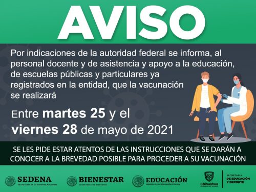 Noticias de Chihuahua.- El secretario de Educación y Deporte informó que del martes 25 al viernes 28 de mayo, se llevará a cabo la jornada de vacunación contra COVID-19 para el personal del sector educativo que previamente realizó su pre-registro a través de la página del Sistema de Información Educativa (SIE): https://sie.chihuahua.gob.mx/.