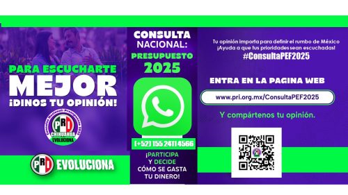 Domínguez Domínguez, hizo un llamado a las y los ciudadanos a que participen en esta consulta, a través de los distintos mecanismos, ya sea mediante el escaneo de Código QR, mostrado a través de las redes sociales institucionales, visitando la página *https://pri.org.mx/ConsultaPEF2025, o bien mediante whatsapp, en el número (+52) 155 2411 4566.