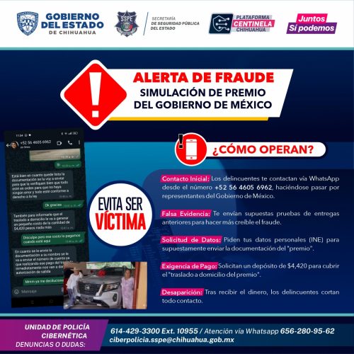 En caso de sospechar de algún sitio o número, comunícate con la Unidad de Policía Cibernética para revisar la veracidad, a través de los números 614-429-3300 ext. 10955, 614-429-7315, vía WhatsApp 656-280-9562, o al correo electrónico ciberpolicia.sspe@chihuahua.gob.mx