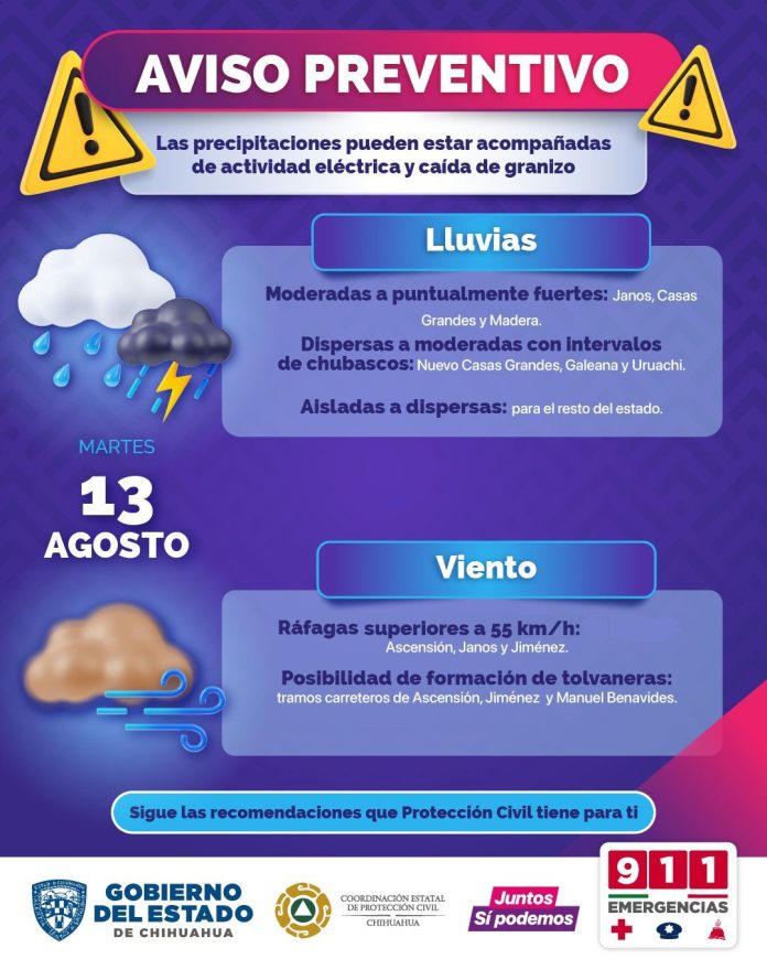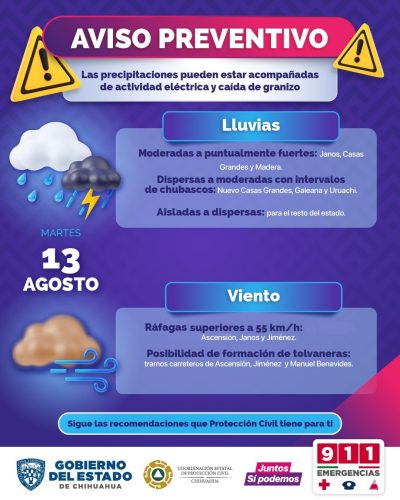Habrá lluvias de aisladas a dispersas en Juárez, Guadalupe, Ahumada, Ascensión, Buenaventura, Namiquipa, Matachí, Bachíniva, Carichí, Nonoava, San Francisco de Borja, Cusihuiriachi, Gran Morelos, Santa Isabel, Riva Palacio y Dr. Belisario Domínguez.