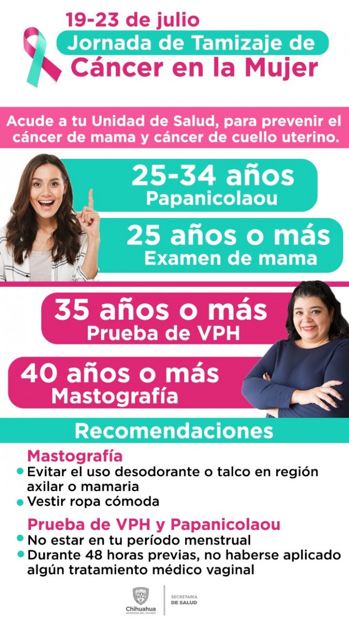 Noticias de Chihuahua.- La Secretaría de Salud, a través del Programa de Cáncer de la Mujer, invita a las mujeres mayores de 25 años a la Jornada de Tamizaje de Cáncer en la Mujer, que se lleva a cabo a partir de este lunes 19 y hasta el viernes 23 julio en las unidades de salud de la entidad que cuentan con el personal especializado para realizar dichos exámenes.