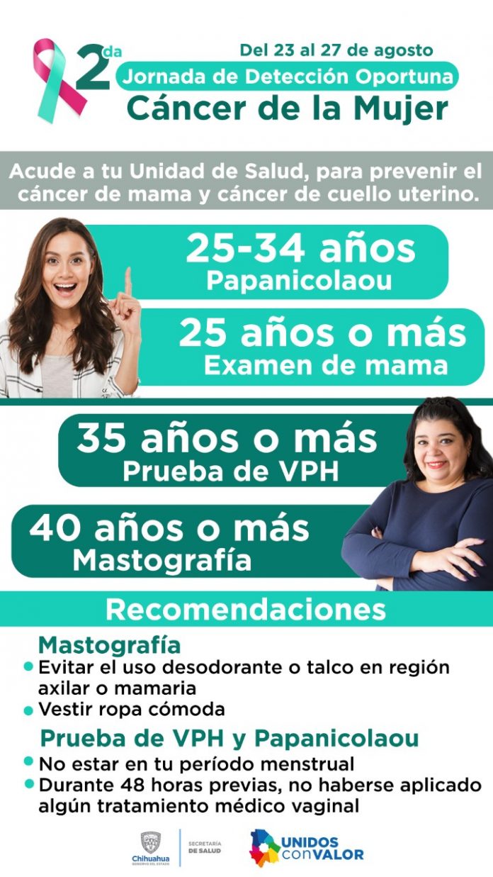 Noticias de Chihuahua.- La Secretaría de Salud, a través del Programa de Cáncer de la Mujer, invita a las mujeres mayores de 25 años a la Segunda Jornada de Detección oportuna de Cáncer en la Mujer, la cual se lleva a cabo a partir de este lunes 23 hasta el viernes 27 de agosto en las unidades de salud de la entidad.