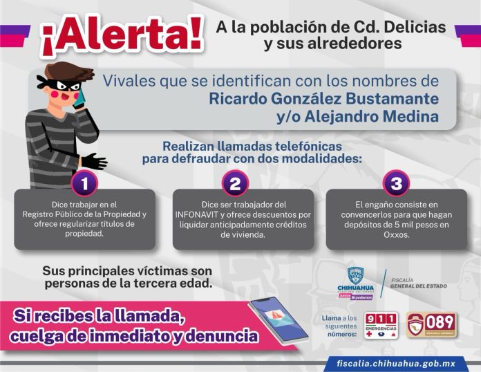 Noticias de Chihuahua.- La Unidad de Investigación Ministerial de la Fiscalía de Distrito Zona Centro en el municipio de Delicias, alerta a la ciudadanía sobre fraudes telefónicos cometidos por quienes se identifican como supuestos empleados de Infonavit y de Registro Público de la Propiedad.
