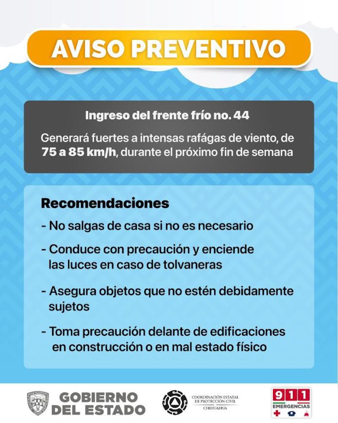Noticias de Chihuahua.- La Coordinación Estatal de Protección Civil (CEPC) informa que para este fin de semana, se prevé la presencia de fuertes vientos en gran parte de la entidad, generados por el ingreso al país del frente frío número 44.