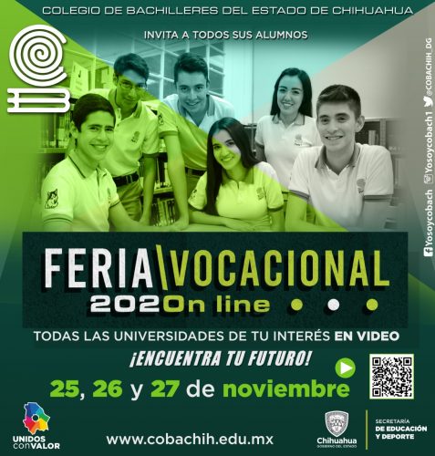 Noticias de Chihuahua.- El Colegio de Bachilleres del Estado de Chihuahua (Cobach) realizará su tradicional Feria Vocacional 2020 los días 25, 26 y 27 de noviembre, que en esta ocasión debido a la pandemia se realizará de manera virtual con una transmisión en vivo desde las redes oficiales de la institución.