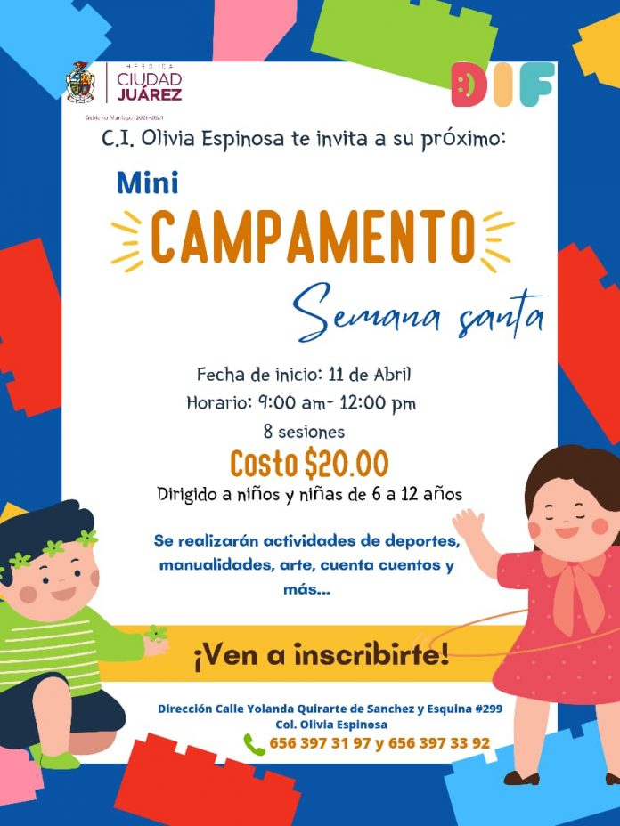 Ciudad Juárez.- El Sistema para el Desarrollo Integral de la Familia del Municipio de Juárez, a través de su Centro Integral Olivia Espinosa, ubicado en el sur oriente de la ciudad, invita a las niñas y niños a su Mini Campamento de Verano Semana Santa que dará inicio el próximo 11 de abril a las 9:00 de la mañana.