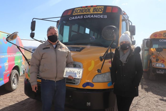 Casas Grandes. – La mañana de este viernes la alcaldesa del Pueblo Mágico, Yesenia Reyes Calzadias, acudió al municipio de Gómez Farias, donde recibió otro camión escolar por parte del Gobernador del Estado, Javier Corral Jurado.