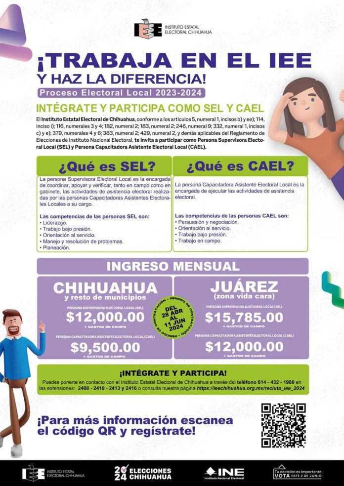 Las personas interesadas pueden atender la convocatoria hasta el día 06 de abril y el periodo laboral será del 28 de abril al 11 de junio del 2024. Todos los detalles de la convocatoria pueden ser consultados en la página de internet del IEE Chihuahua: https://ieechihuahua.org.mx/recluta_iee_2024