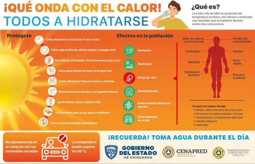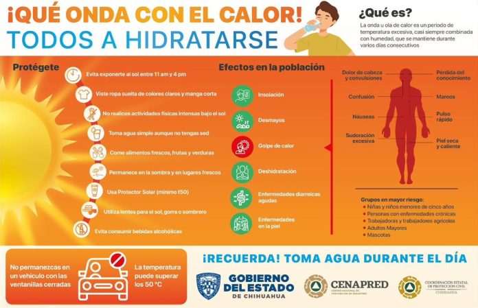 Noticias de Chihuahua.- La Coordinación Estatal de Protección Civil (CEPC) dio a conocer que para este lunes 17 y el martes 18 de junio, se prevé que la combinación de diversos sistemas atmosféricos genere un ambiente muy caluroso en gran parte de la entidad, con fuerte radiación solar y presencia de vientos moderados.